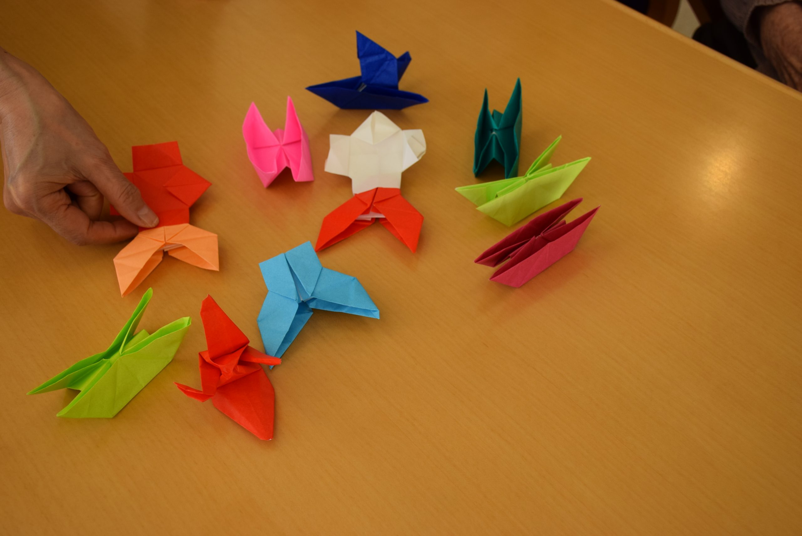 入居者の皆さまと「昔あそび」でトランプや折り紙をしました。
